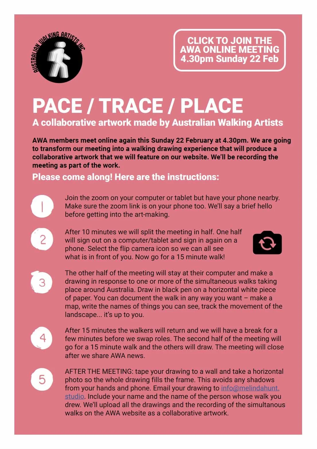 At 4.30pm on Sunday 22 February 17 AWA members from around Australia met online to follow a prompt (left) devised by walking artist, Melinda Hunt. The artists’s intention was to transform a meeting into a collaborative artwork consisting of a collection of walks undertaken by members during the meeting and set of drawings made in response to those walks. The proceedings were recorded and are available below.
